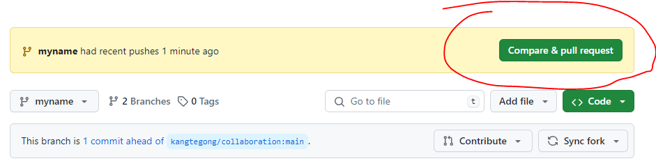 깃허브에 이러한 버튼이 생기면 이 버튼이 클릭하면 풀리퀘스트를 보낼수 있다.